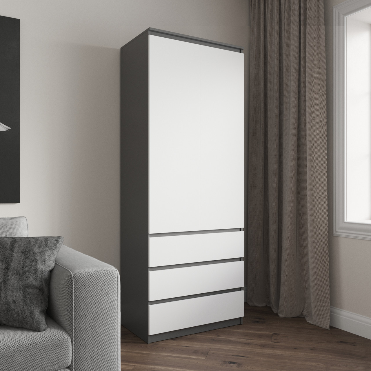 Шафа для одягу на 3 висувних ящика c полицями, фасади без ручок R-16 Антрацит-Білий фасад